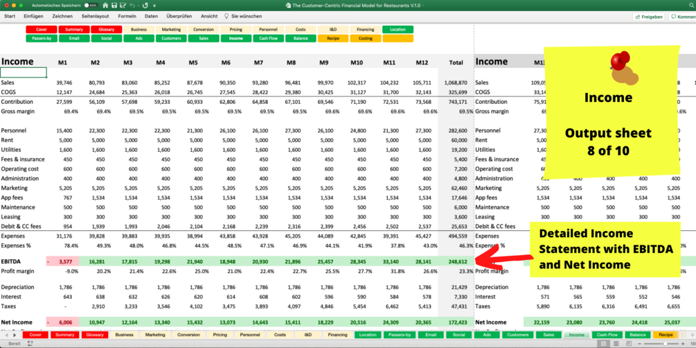 Unique financial excel model for restaurants with a strong focus on customer behavior, prices, and marketing.